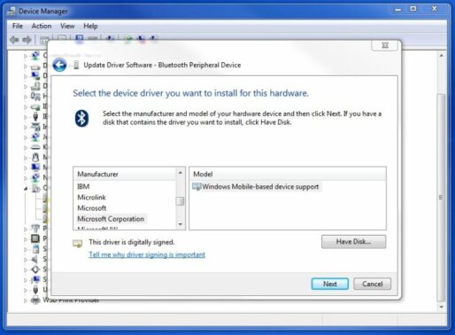 - Pilihan baru akan bermunculan, Anda bisa memilih Bluetooth lalu dilanjutkan ke manufaktur, untuk kasus ini Microsoft Corporation. Selanjutnya untuk jenis atau modelnya Anda bisa memilih Windows Mobile-based device support.