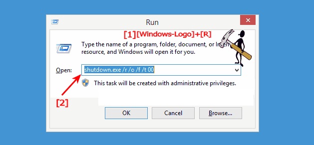 - Atau kalau tidak bisa restart, tekan Windows+R, lalu ketik “shutdown.exe/r /o” dan enter.