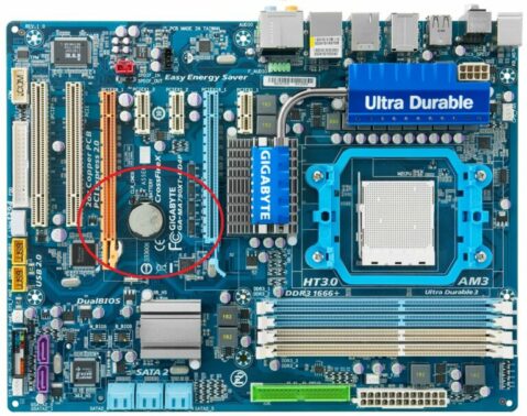 CMOS (Complimentary Metal Oxide Semiconductor) adalah baterai yang bertugas untuk memasok daya ke memori kecil yang berada pada motherboard. Memori ini berfungsi untuk menyimpan setelan konfigurasi pada komputer seperi waktu, hari, tanggal dan lain sebagainya. Melalui slot ini, pengguna tidak perlu mengatur setting tersebut setiap hari.