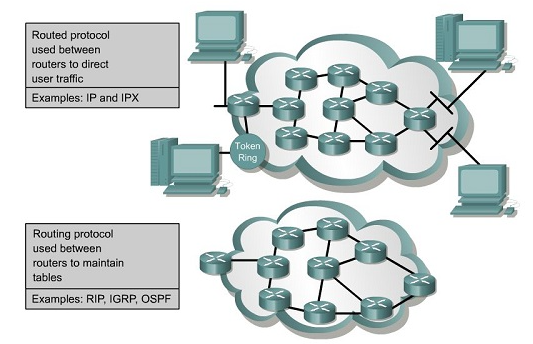 Protokol yang digunakan oleh router untuk mengirim data pengguna dari satu jaringan ke yang lain. Dengan demikian Protokol perutean ini membawa lalu lintas data, seperti transfer file, email, dan lalu lintas jaringan lainnya. Contoh protokol yang ditransmisikan: IPX, IP, DECnet, dan AppleTalk.