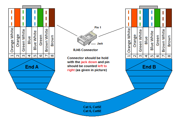 Konektor RJ-45 adalah untuk menghubungkan antara komponen komputer. Di mana konektor RJ-45 berada, ada 8 pin di dalamnya. Maka jika ingin membuat susunan jenis kabel Straight, Anda wajib untuk menempatkan setiap susunan pada kabel yang dirangkai kepada konektor RJ-45, sesuai standar. Singkatnya, pin 1 di ujung kabel terhubung ke pin 1 di ujung kabel yang lain. Demikian seterusnya hingga pin 8.